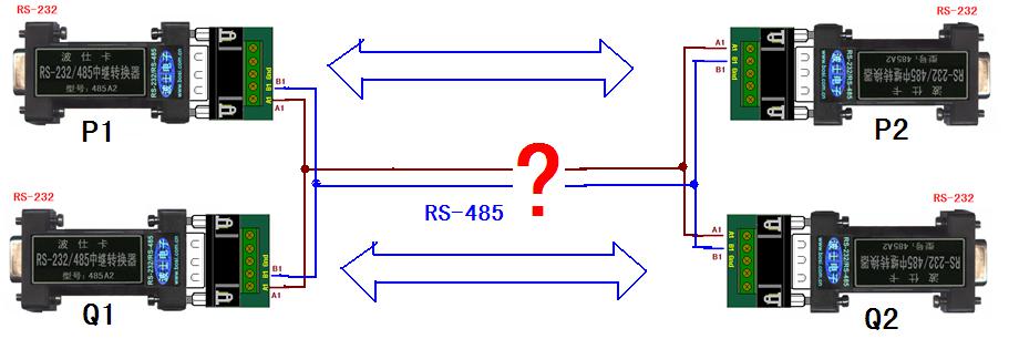 要實(shí)現(xiàn)2對(duì)RS-232需要通信,即P1與P2通信、Q1與Q2通信,但是能否共用一條RS-485總線呢?顯然在同一條RS-485總線中,P1的數(shù)據(jù)不僅會(huì)傳到P2,也會(huì)傳到Q2甚至Q1,其它節(jié)點(diǎn)也一樣。