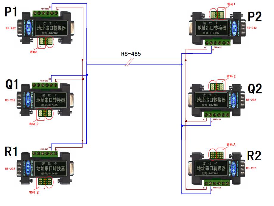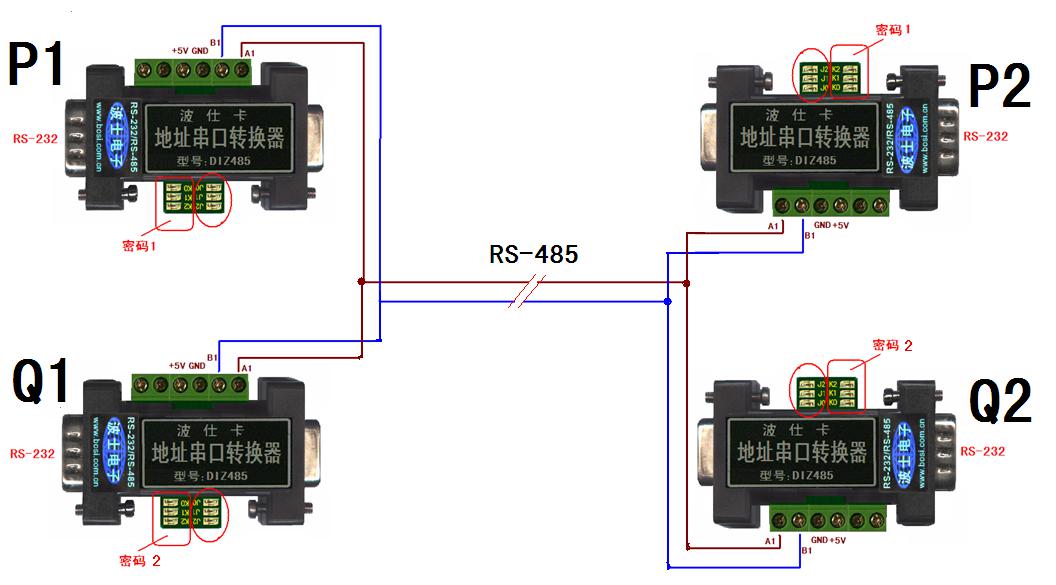 要做到這一點(diǎn),就必須P1與P2使用同樣密碼(比如密碼1),Q1與Q2使用相同密碼(比如密碼2)。特別注意,所有RS-485總線的端子使用位于右側(cè)的端子(A1B1),RS-232使用DB-9針端。