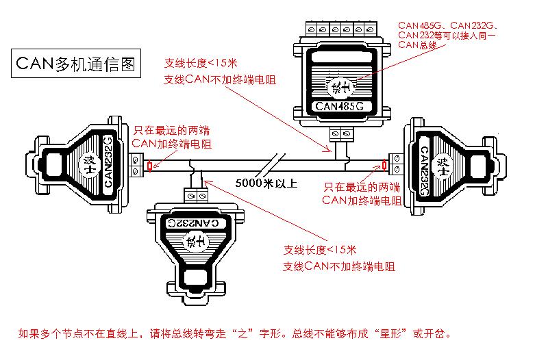 CAN232、CAN232G、CAN485G通信需要兩根信號線(最好加一根地線)。當(dāng)導(dǎo)線電阻率太大或?qū)Ь直徑太小時(shí),可以用多根細(xì)導(dǎo)線并聯(lián)當(dāng)成一根較粗的導(dǎo)線使用。當(dāng)通信距離較遠(yuǎn)而使用多段導(dǎo)線續(xù)接時(shí),注意各段導(dǎo)線之間必須實(shí)現(xiàn)可靠電連接,最好用烙鐵電焊連接。建議在鋪設(shè)長距離電纜之前先用三用表測量電纜的電阻率(對照上表,單位:毫歐姆/米)。當(dāng)距離比較遠(yuǎn)時(shí),建議多布一根地線(即:電源地線),這樣可以抗干擾、減少誤碼、避免損壞CAN接口。如果通信線附近有較大的干擾信號,建議使用屏蔽導(dǎo)線并且將屏蔽層作為地線。 CAN信號遠(yuǎn)傳的線必要的只有CANH(+)和CANL(—)兩根線。兩個(gè)CAN232相對接時(shí),CANH(+)接對方的CANH(+)、CANH(—)接對方的CANH(—)。CAN總線通信時(shí)要求在相距最遠(yuǎn)的兩個(gè)轉(zhuǎn)換器的CANH(+)、CANL(—)腳之間各接電阻(參考值見上表,沒有嚴(yán)格規(guī)定,產(chǎn)品已經(jīng)內(nèi)置1500Ω電阻,可以在端子上并聯(lián)減小電阻)。 附: CAN多機(jī)通信組網(wǎng)圖參考: 波仕與您暢游RS232/RS485串口的世界