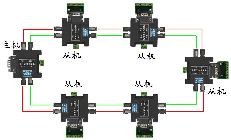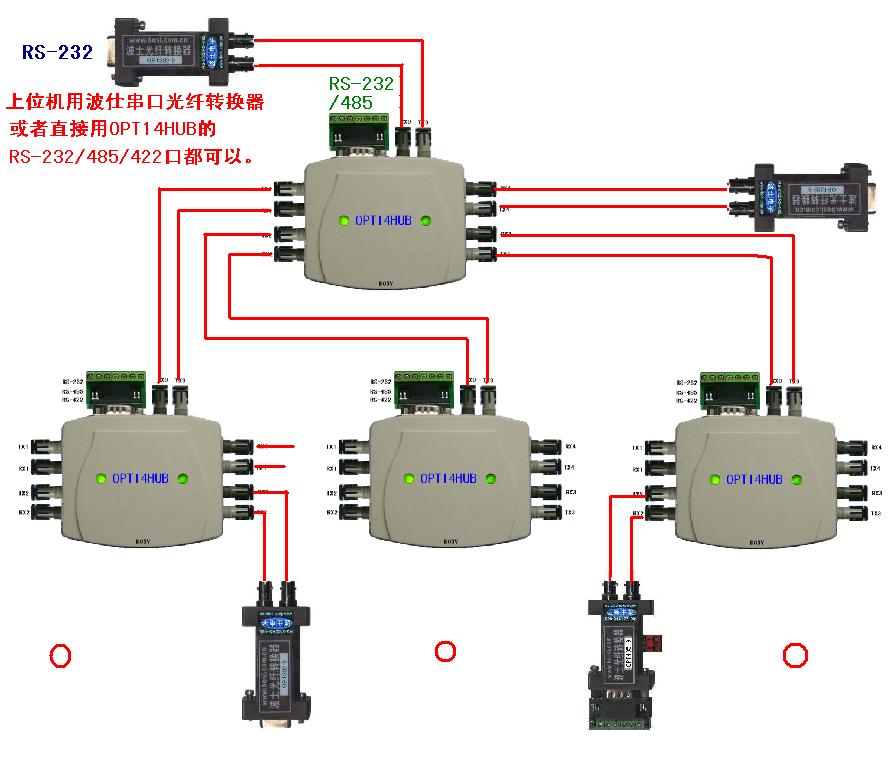 OPT14HUB星形光纖組網(wǎng)多機(jī)通信圖 OPT22雙環(huán)光纖組網(wǎng)多機(jī)通信圖